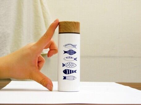 木目調の蓋とネイビーの北欧柄が特徴です。