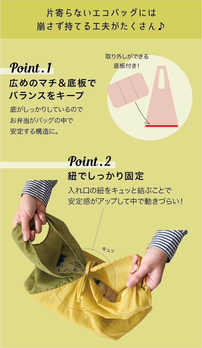 普通のエコバッグだといつの間にか片寄って崩れちゃってる…そんなコンビニのお弁当やお惣菜を崩さず持ち歩ける安定感抜群のエコバッグです。
